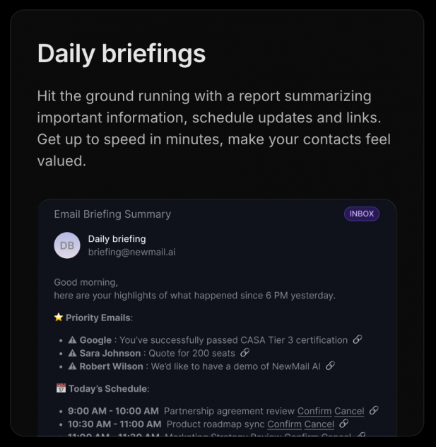 Meet NewMail, your AI inbox partner designed for busy professionals. It learns your tone, replies to messages, handles follow-ups, and books calls—so you can focus on relationships and results.