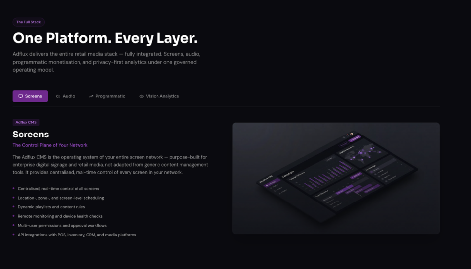 Adflux CMS is a cloud-based retail media platform that enables retailers, shopping centres, and out-of-home media owners to efficiently manage, schedule, and monetise advertising across digital screens and audio networks. The platform features programmatic SSP integration, AI-powered analytics, remote device monitoring, and proof-of-play reporting to ensure transparent, data-driven campaign performance.